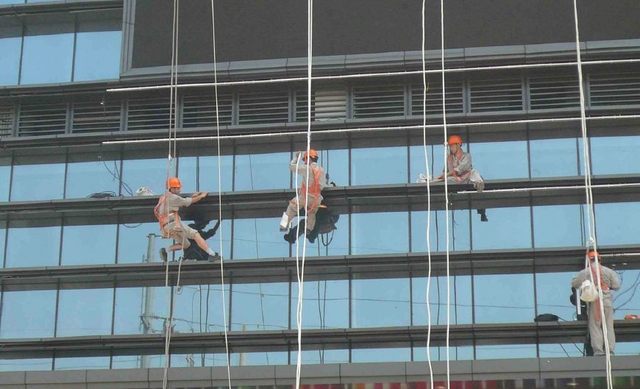 應(yīng)根據(jù)幕墻面積灰污染程度,確定清洗幕墻的次數(shù)與周期,每年應(yīng)至少清洗兩次;清洗幕墻外墻面的機(jī)械設(shè)備(如清洗機(jī)或吊籃等)和工具,應(yīng)安全可靠、操作靈活方便,以免擦傷和碰壞幕墻表面。清洗幕墻應(yīng)選用對玻璃及構(gòu)件無腐蝕作用的中性清潔劑清洗,較后用清水洗刷干凈。注意:清洗玻璃和鋁合金件的中性清潔劑,應(yīng)進(jìn)行腐蝕性檢驗(yàn)。禁止用有腐蝕性的清潔劑清洗!中性清潔劑清洗后應(yīng)及時用清水沖洗干凈。